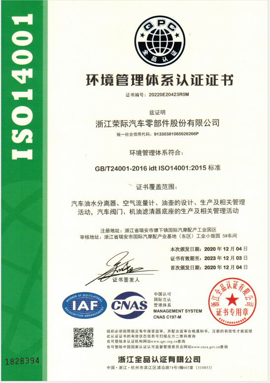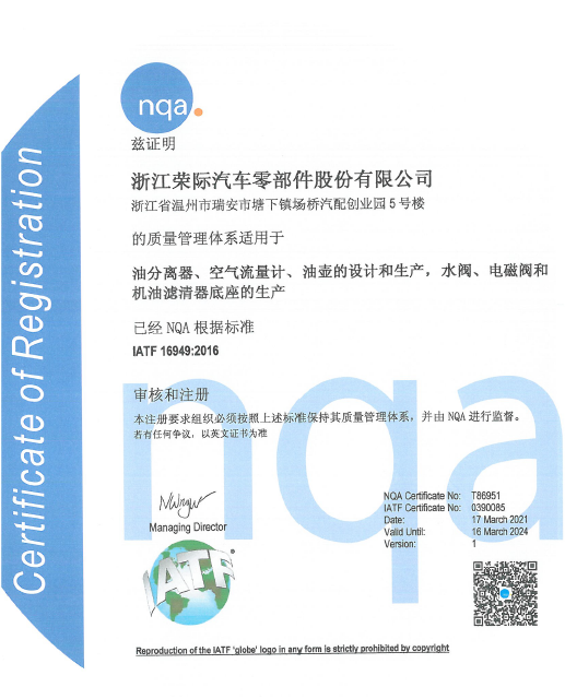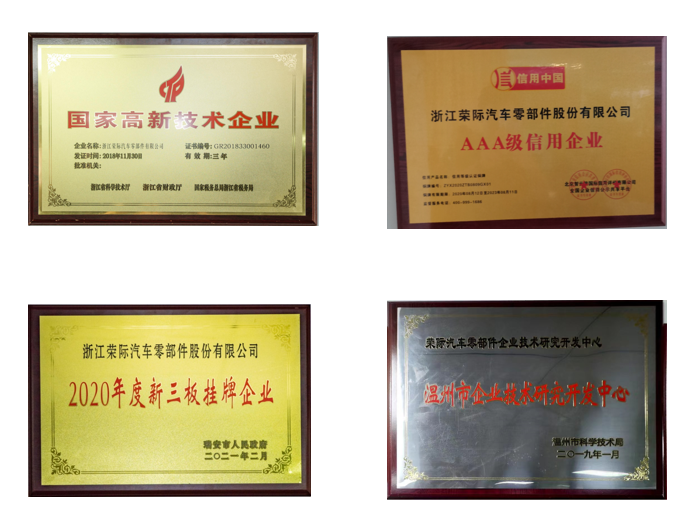 浙江荣际股份坐落于浙江省瑞安市塘下镇场桥汽配创业园。公司现有员工200多人包括工程师超20人和质检人员10人,厂房总面积17800平方米。浙江荣际成立于2006年,是一家以研发、生产和销售为一体的综合企业,主营产品为 新能源电池包护板、发动机护板、挡泥板、德系车的汽车油分离器、机滤座总成、暖风水阀和空气流量计等。经过多年的努力,已与国内外一流的主机、配套企业、建立稳固的合作关系。产品远销美国、德国、意大利、波兰、西班牙、俄罗斯等欧美众多国家。目前与公司已经通过IATF16949质量管理体系、ISO45001职业健康管理体系、ISO14001环境管理体系;并在2018年先后荣获浙江省科技型企业和国家高新技术企业、温州市首批绿色工厂、浙江省省级研发中心。 目前公司拥有5项发明专利,2项外观专利以及20余项实用型专利。公司始终贯彻“质量第一、顾客满意、持续改进、永无止境”的宗旨,与客户携手共进,互惠互利 。